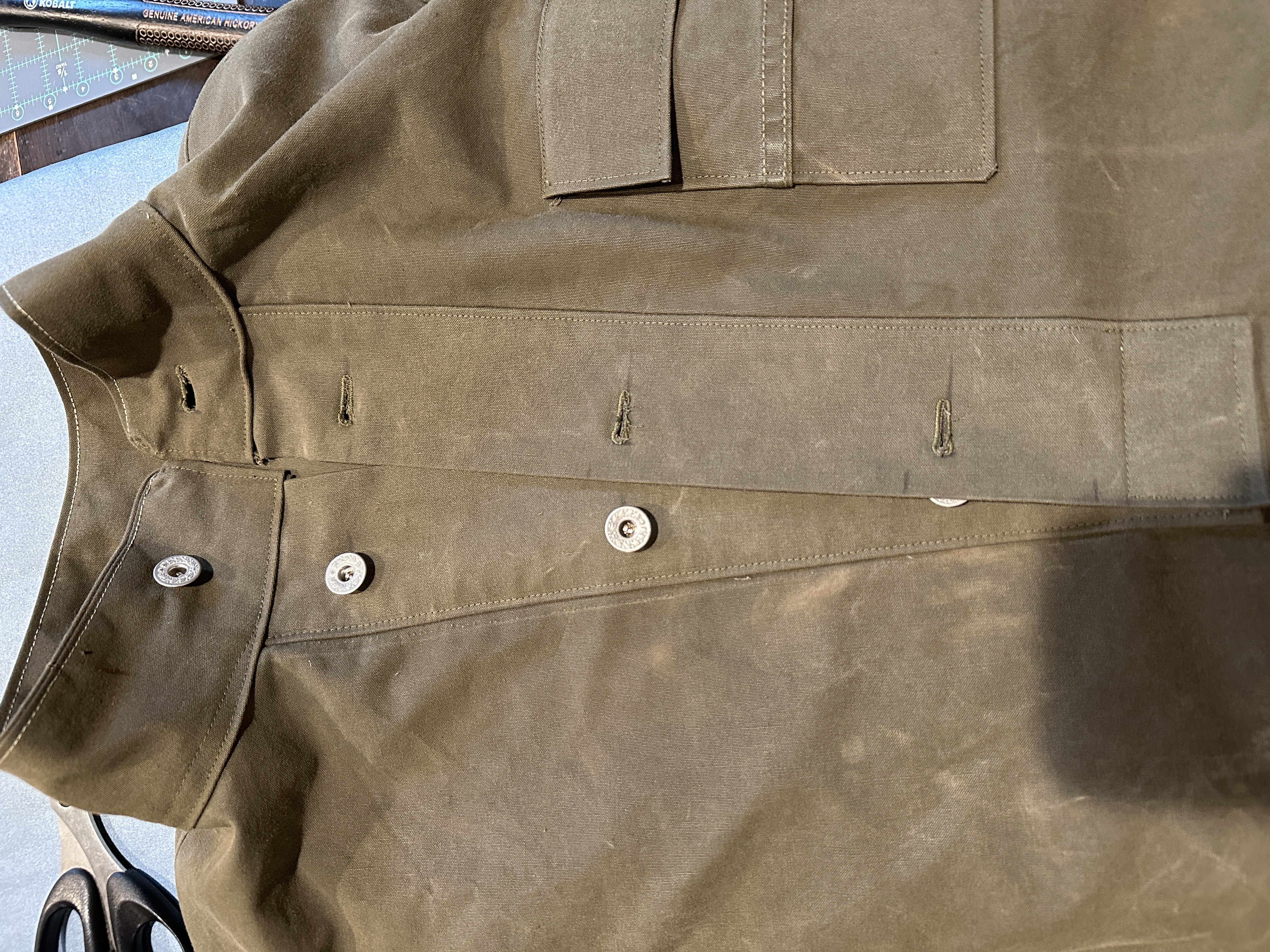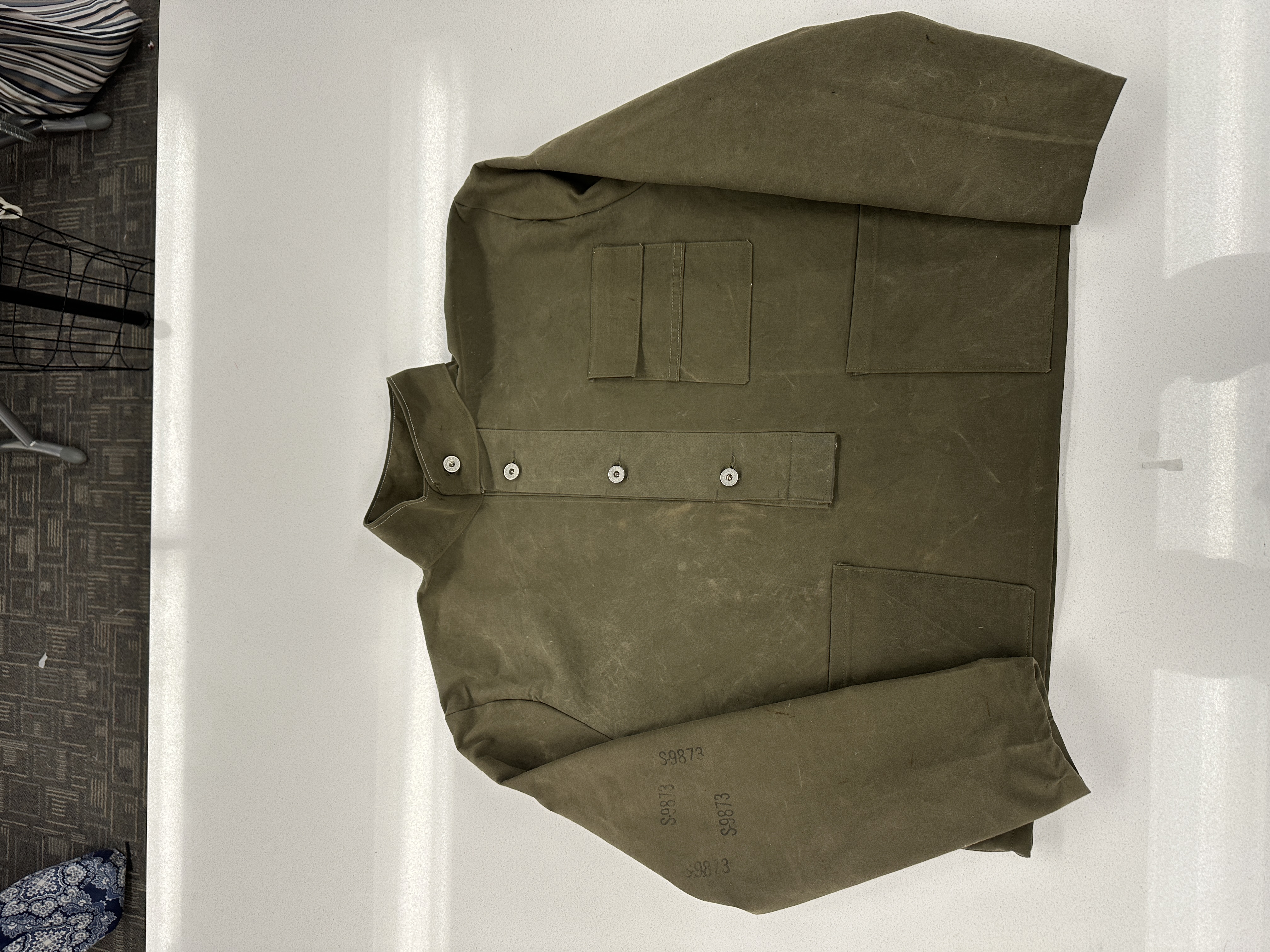 This 1944 Military tarp was found at a local yardsale and was repurposed into a jacket. Giving a new life that might have been thrown away.